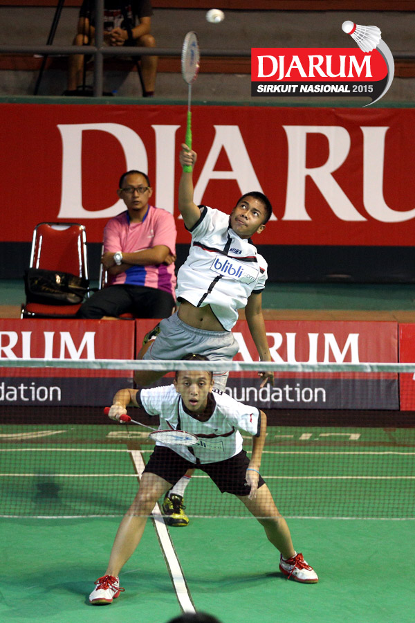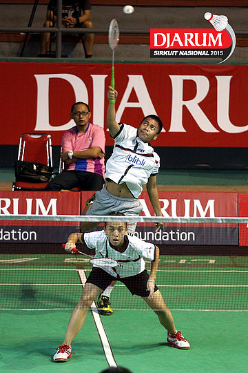 Deny Surya/Miftahul Rahma (Semen Gresik) melepaskan serangan ke arah Evan Oroh/Nasrani Dondokambey (Winner BC Manado).