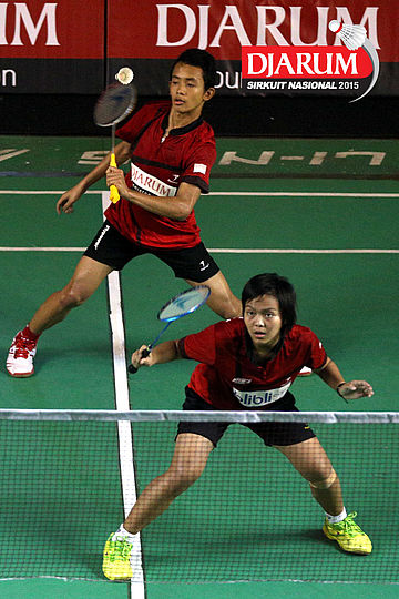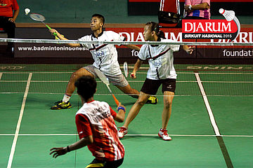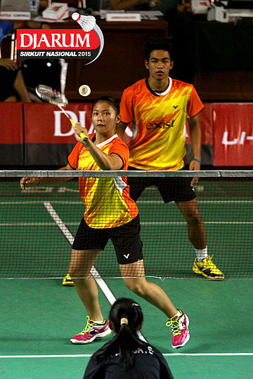 Haikal Afrizal/Karina Ria (Hevindo Balikpapan) mengembalikan shuttlecock ke arah Devand Riefky/Febriana Dwipuji (Djarum Kudus).