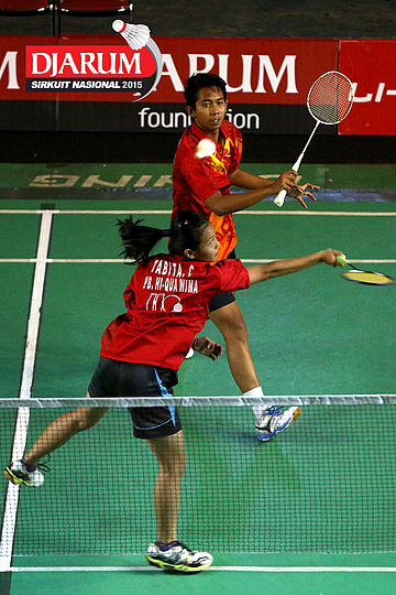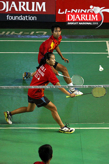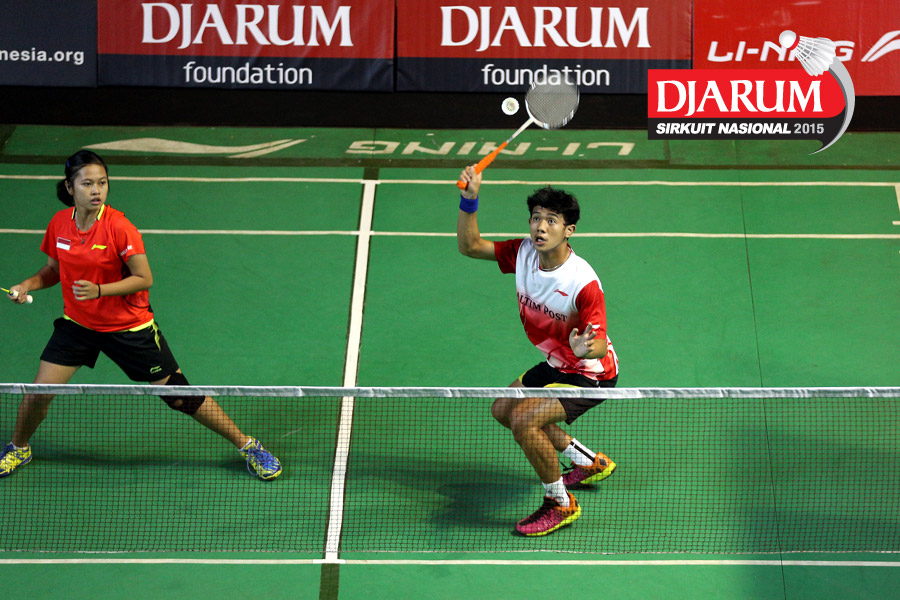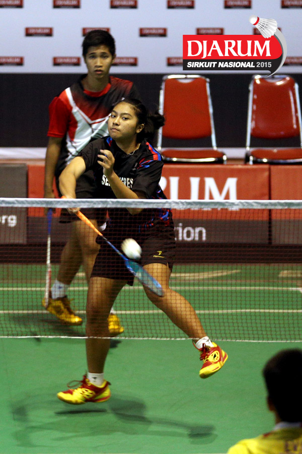 M. Taufiqul/Siti Fadia (Djarum Kudus) bersiap menghadang serangan yang dilepaskan Otnil Marbowo/A. Sakina (SMANOR Tadulako).