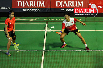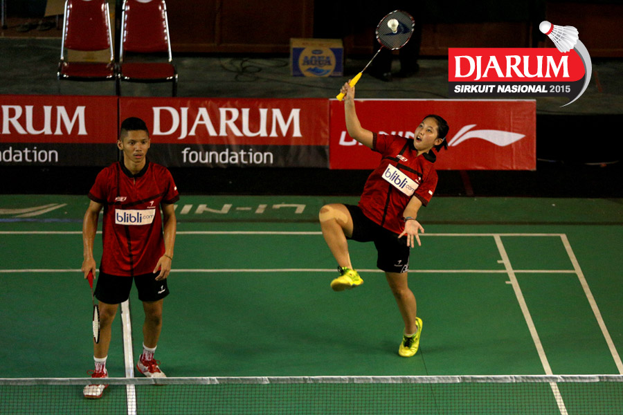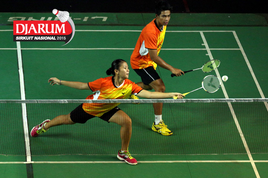 M. Taufiqul/Siti Fadia (Djarum Kudus) mengembalikan shuttlecock ke arah Otnil Marbowo/A. Sakina (SMANOR Tadulako).