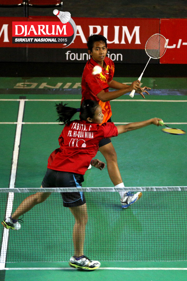 Rizal May/Tabita Christian (Hi Qua Wima) melepaskan serangan ke arah Aldy Dwi/Millenia Falidety (Suryanaga Surabaya).