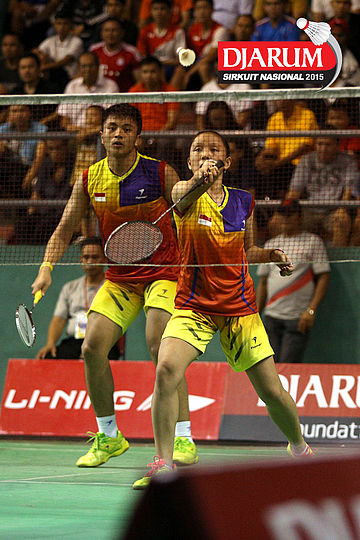 Trikusuma Wardhana/Meiliana Jauhari (Suryanaga/Djarum Kudus) menyambut pengembalian dari Ardiansyah Putra/Devi Tika Permatasari (Berkat Abadi).