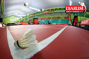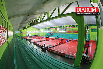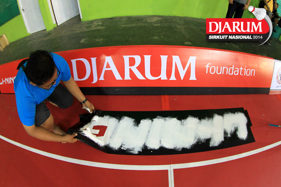Salah satu pekerja sedang mempersiapkan perlengkapan Djarum Sirkuit Nasional Li-Ning Open Sumatera Barat Open 2014