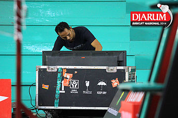 Seorang pekerja sedang mempersiapkan perlengkapan layar scoring Djarum Sirkuit Nasional Li-Ning Open Sumatera Barat Open 2014