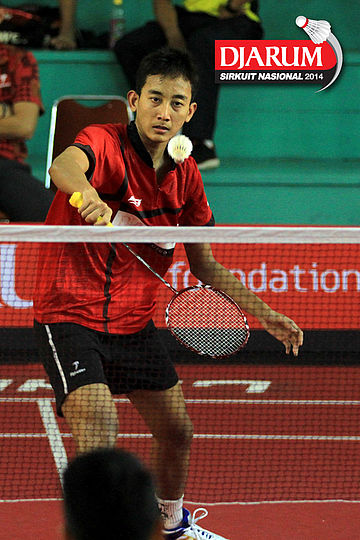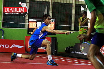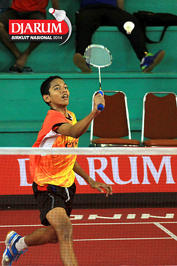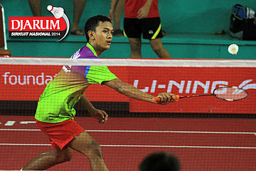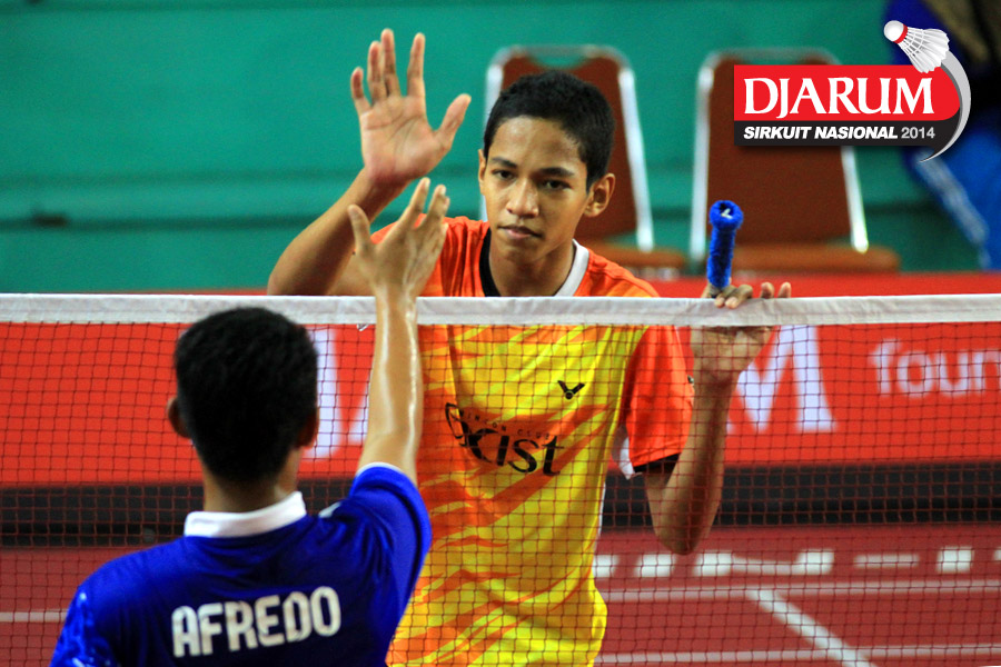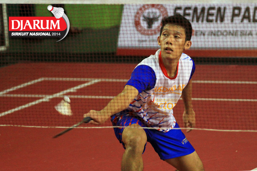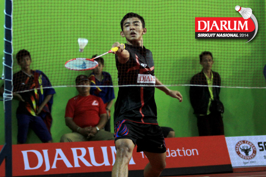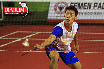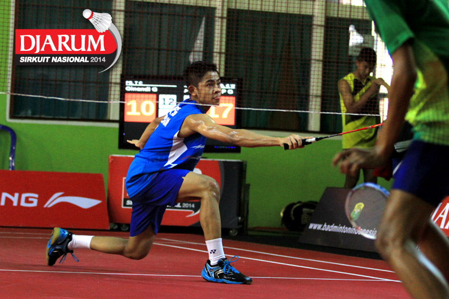 Radhian (Dispora Jambi) bersiap menyambar pengembalian dari Handoko Yusuf (Djarum Kudus)