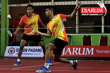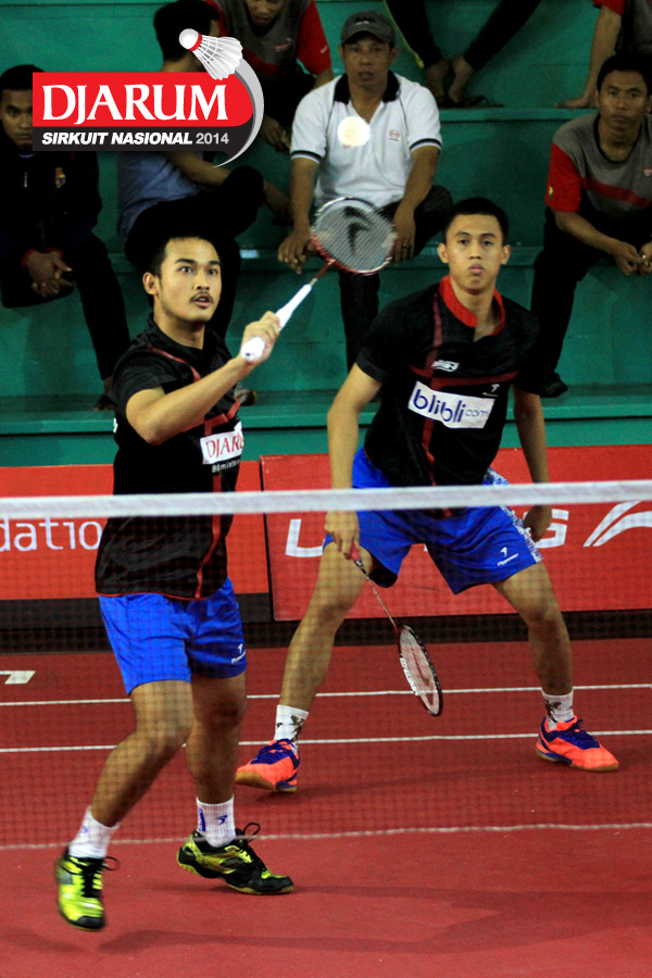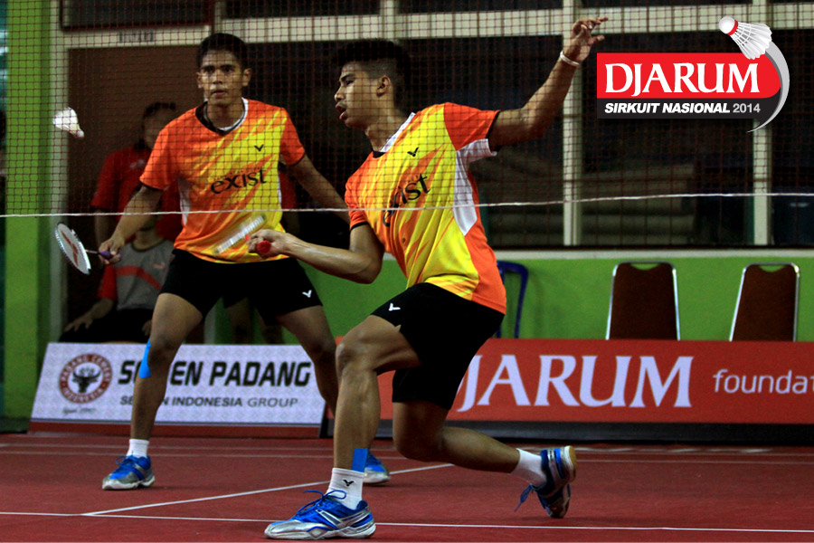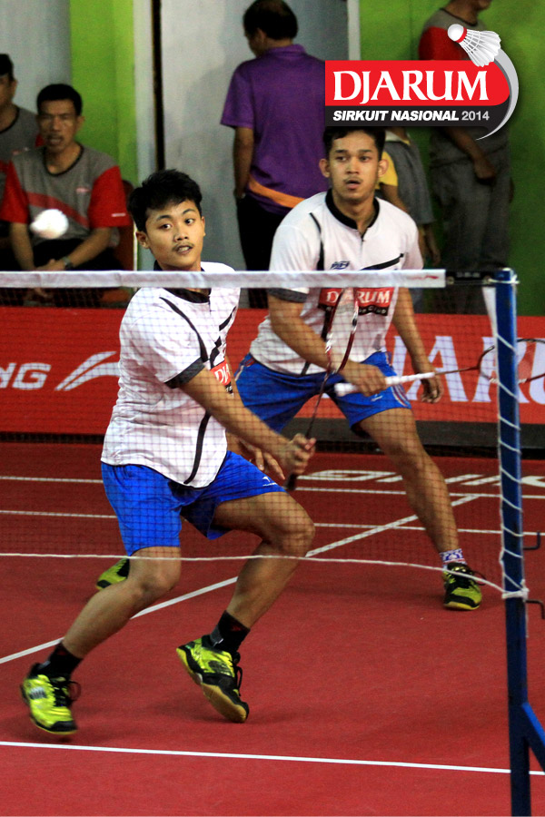 Akbar Bintang/Jeka Wiratama (Djarum Kudus) mengembalikan shuttlecock ke arah Ari Taufik/Randhi Reynaldi (SGS PLN)
