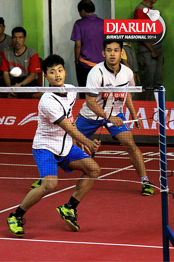 Angger Sudrajat/Tedi Supriadi (Djarum Kudus) bersiap menyambut pengembalian dari Andrean Syahputra/Rezky Akbar (Hi Qua Wijaya)