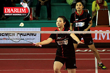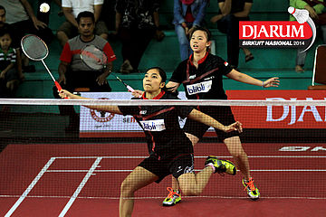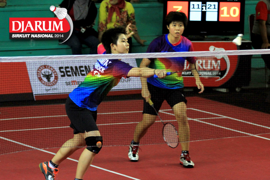 Jessica Muljati/Yulia Yosephine (Shamrock Medan) menyambar pengembalian dari Deariska Putri/Sri Wulan (Djarum Kudus/Jaya Raya)