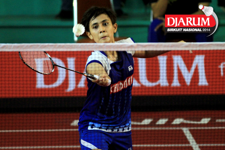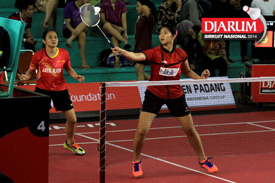 Della Augustia/Ristya Ayu (Djarum Kudus) mengembalikan shuttlecock ke arah Nana Hidayati/Rani Wahyuni (PBSI Bukit Tinggi)