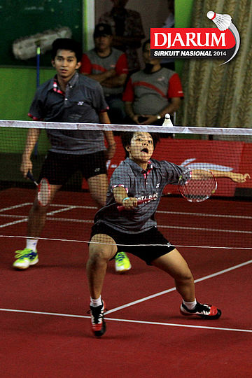 Ardiansyah Putra/Devi Tika Permatasari (Berkat Abadi/SGS PLN) bersiap menyambar pengembalian tanggung dari Anggun Nugroho/Sri Wulan (Halim/Jaya Raya)
