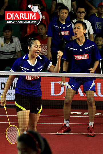 Selebrasi M. Roby Darwis/Monika Insany (Mutiara Cardinal) setelah berhasil mengalahkan Feisal Wiranto/Serena Kani (Djarum Kudus)
