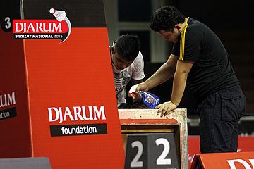 Dua orang pekerja saat memasang dekorasi Djarum Sirkuit Nasional Li-Ning Sumatera Selatan Open 2015