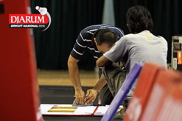 Dua pekerja saat menyelesaikan dekorasi Djarum Sirkuit Nasional Li-Ning Sumatera Selatan Open 2015