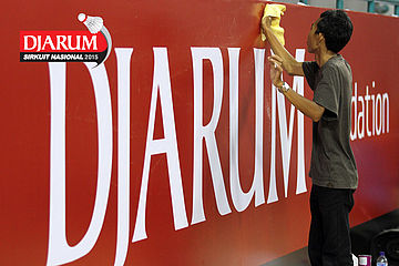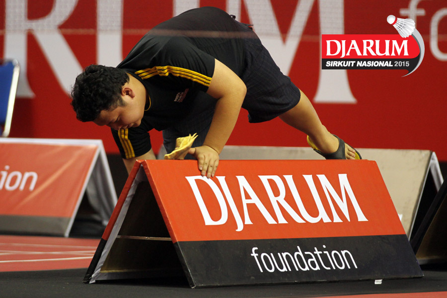 Seorang pekerja saat menyelesaikan dekorasi Djarum Sirkuit Nasional Li-Ning Sumatera Selatan Open 2015