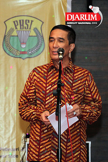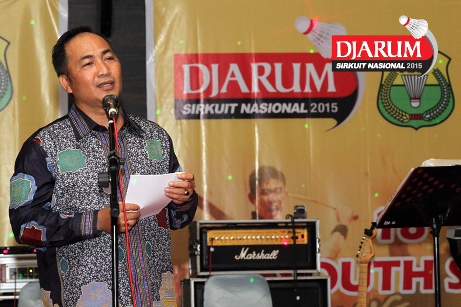 Asisten III Pemerintah Provinsi Sumatera Selatan, Ahmad Najib saat mewakili Gubernur dalam memberikan sambutan sekaligus membuka gelaran Djarum Sirkuit Nasional Li-Ning Sumatera Selatan Open 2015