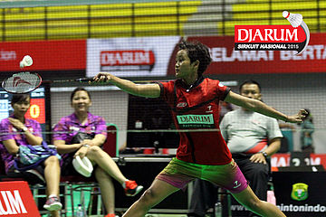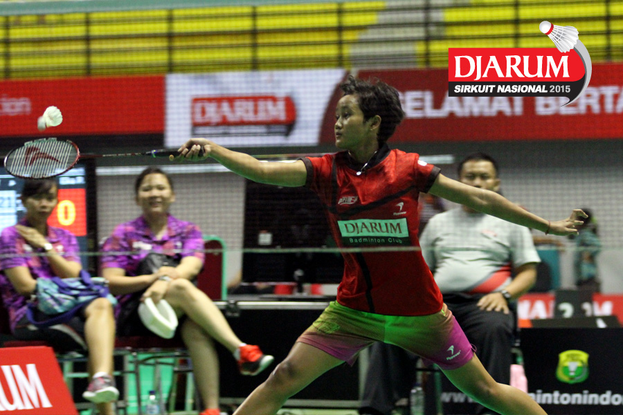 Meilani Wigyantari (Djarum Kudus) mengembalikan shuttlecock.