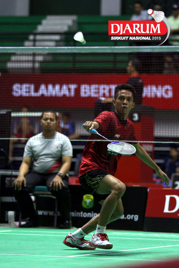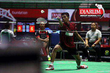 Noval Ramdhan (Djarum Kudus) mengembalikan shuttlecock.