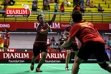Jeka Wiratama/Della Augustia (Djarum Kudus) mengembalikan shuttlecock.