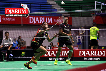 Trikusuma Wardhana/Meiliana Jauhari (Suryanaga Surabaya/Djarum Kudus) melepaskan serangan.