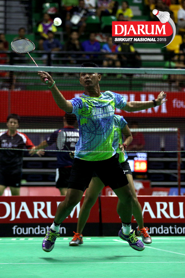 Markis Kido/Pia Zebadiah (Jaya Raya) mengembalikan shuttlecock.