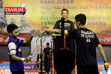 Riyanto Subagja (Djarum Kudus) Memberikan Shuttlecock Kepada Mochamad Rehan Diaz (Mutiara Cardinal)