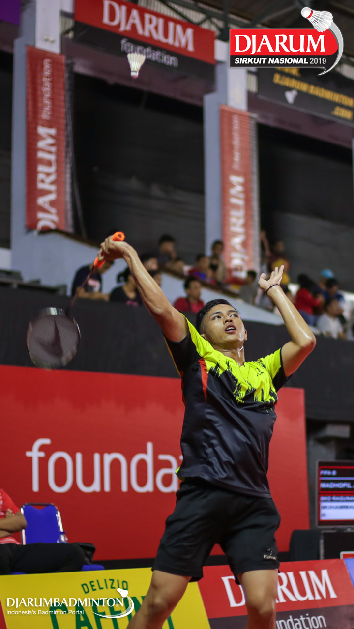 Galih Prasetyo Utomo (Nikko Steel Malang) bersiap menyambut shuttlecock