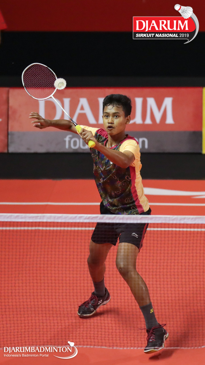 Muhammad Fachri Akbar Romadhon (Sekolah Khusus Olahraga Ragunan) bersiap menyambar pengembalian