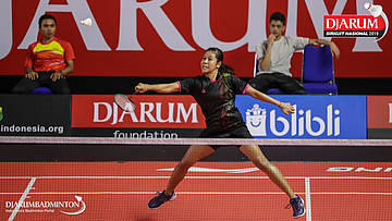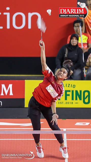 Debora Pungky Cahyadewi (PB. Inti Badminton Club Klaten) melepaskan serangan
