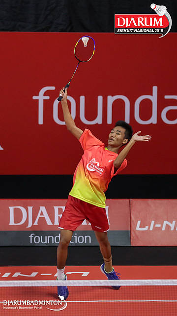 Jovi Michael (Focus Badminton Club, Jaksel) bersiap menyambut shuttlecock