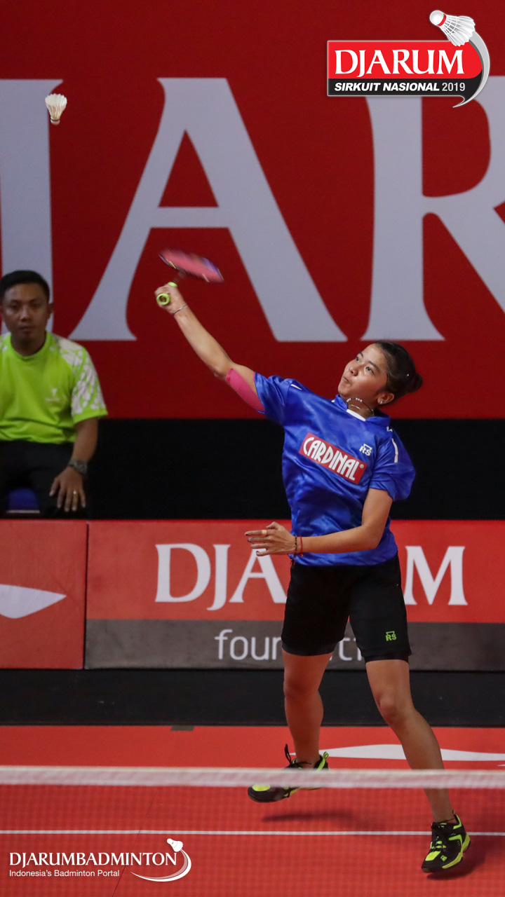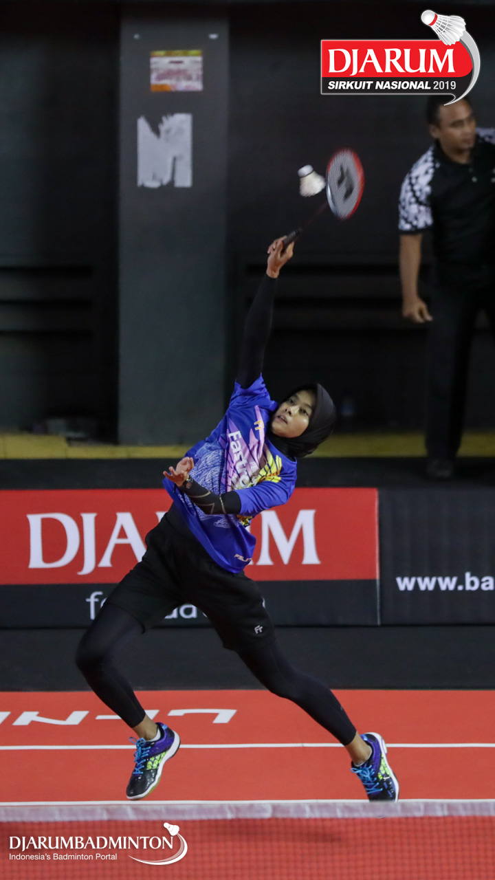 Shabrina Aulia Yasmin (Mutiara Cardinal, Bandung) bersiap menyambar shuttlecock