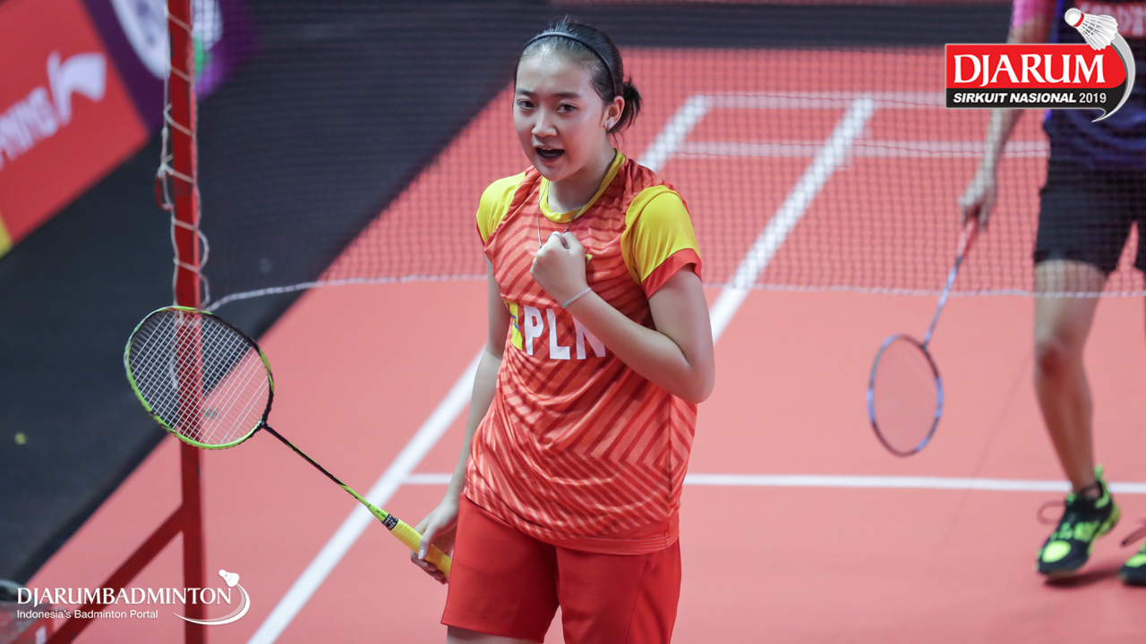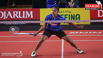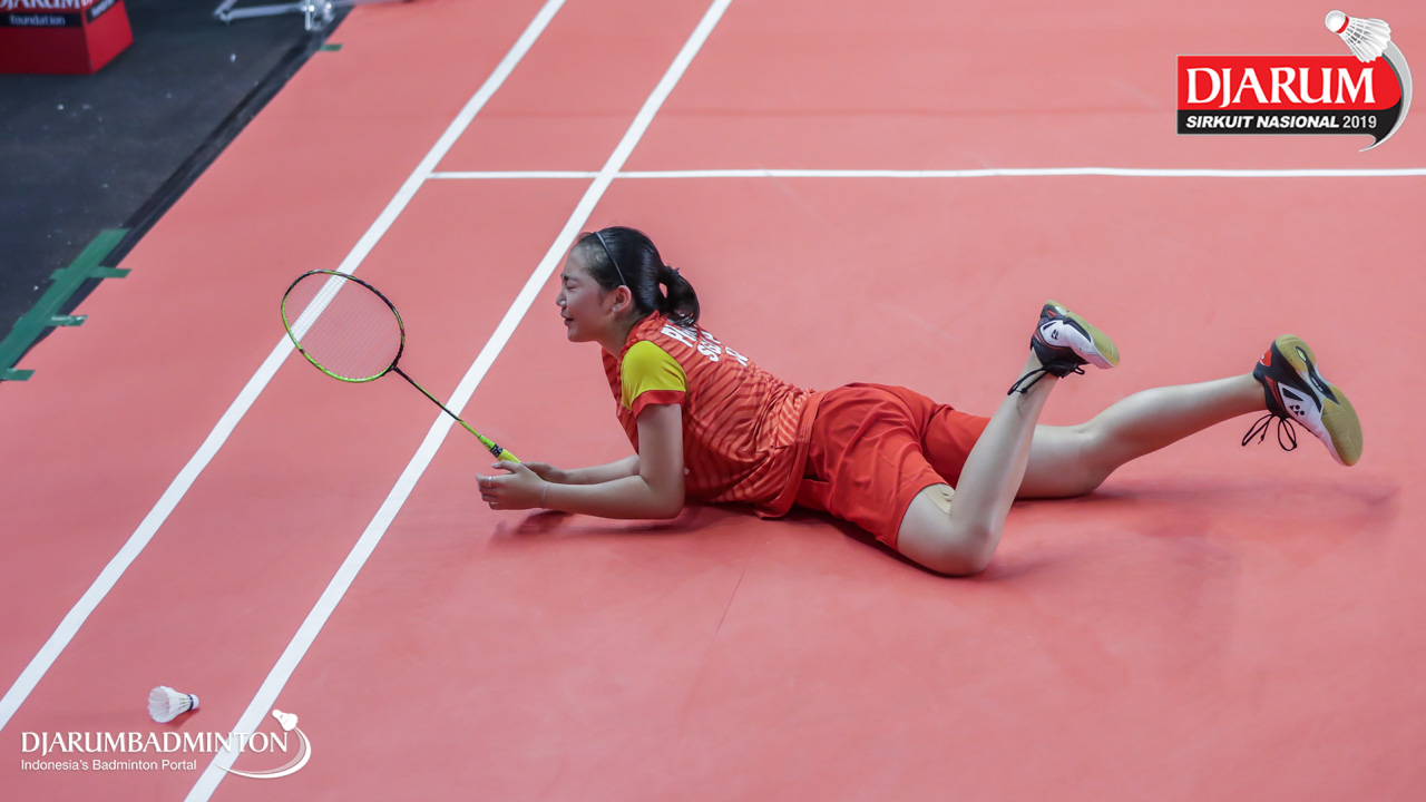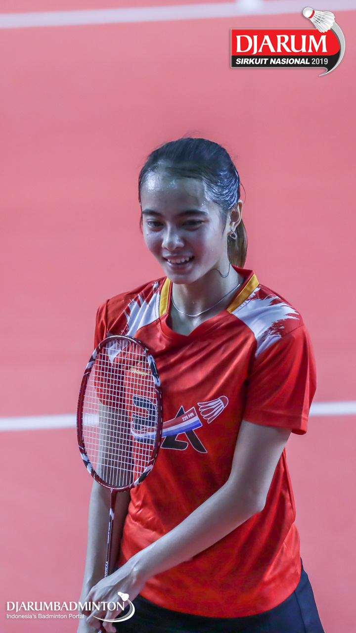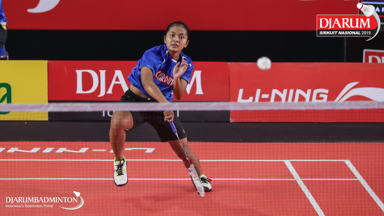 Shabrina Aulia Yasmin (Mutiara Cardinal, Bandung) bersiap menyambut shuttlecock