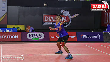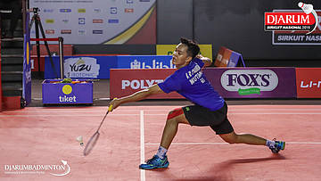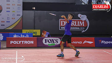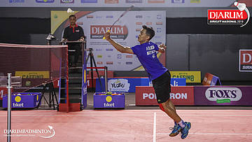 Alvi Wijaya Chairullah (Mutiara Cardinal, Bandung) bersiap mengembalikan shuttlecock