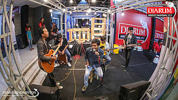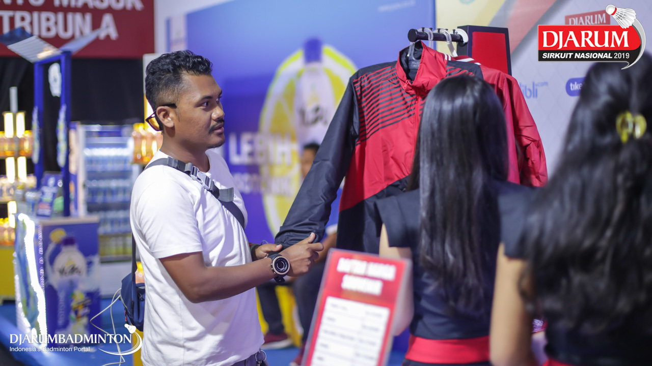 Dua orang pengunjung saat memilih merchandise di booth djarum