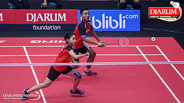 Ghana Muhammad Al Ilham+Khusnul Khatimah (PB Djarum, Kudus) mengembalikan serangan