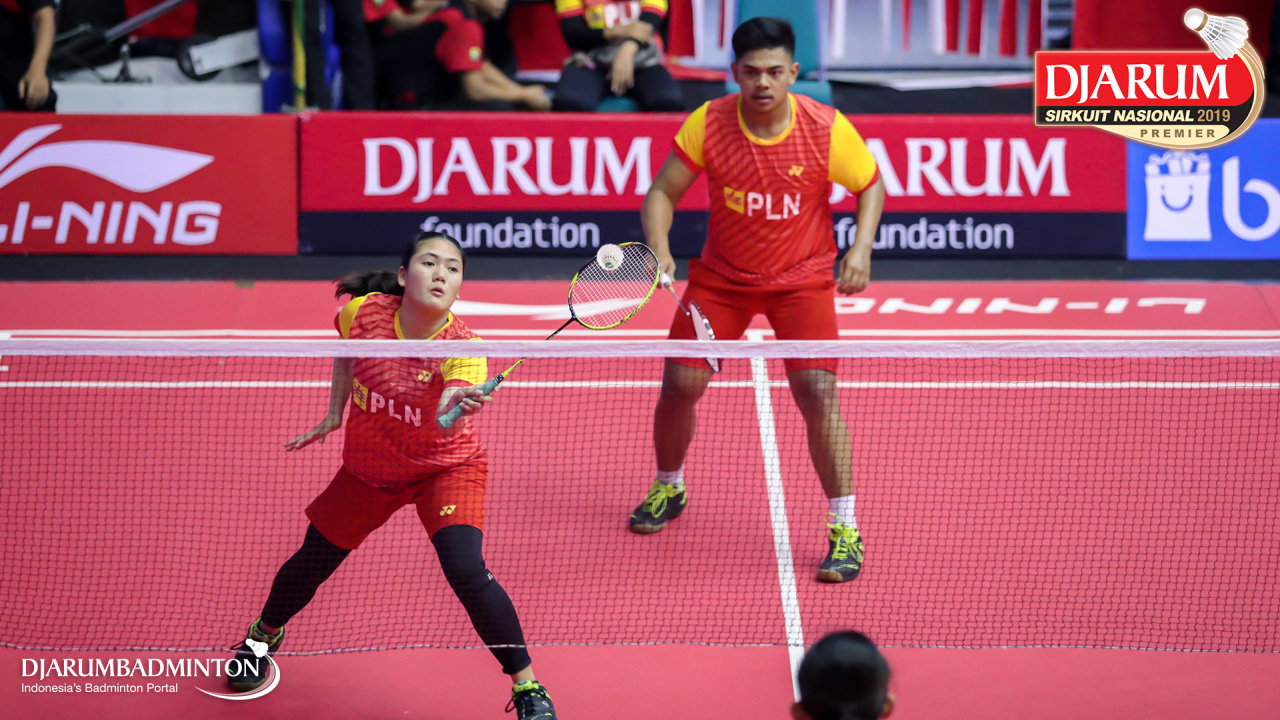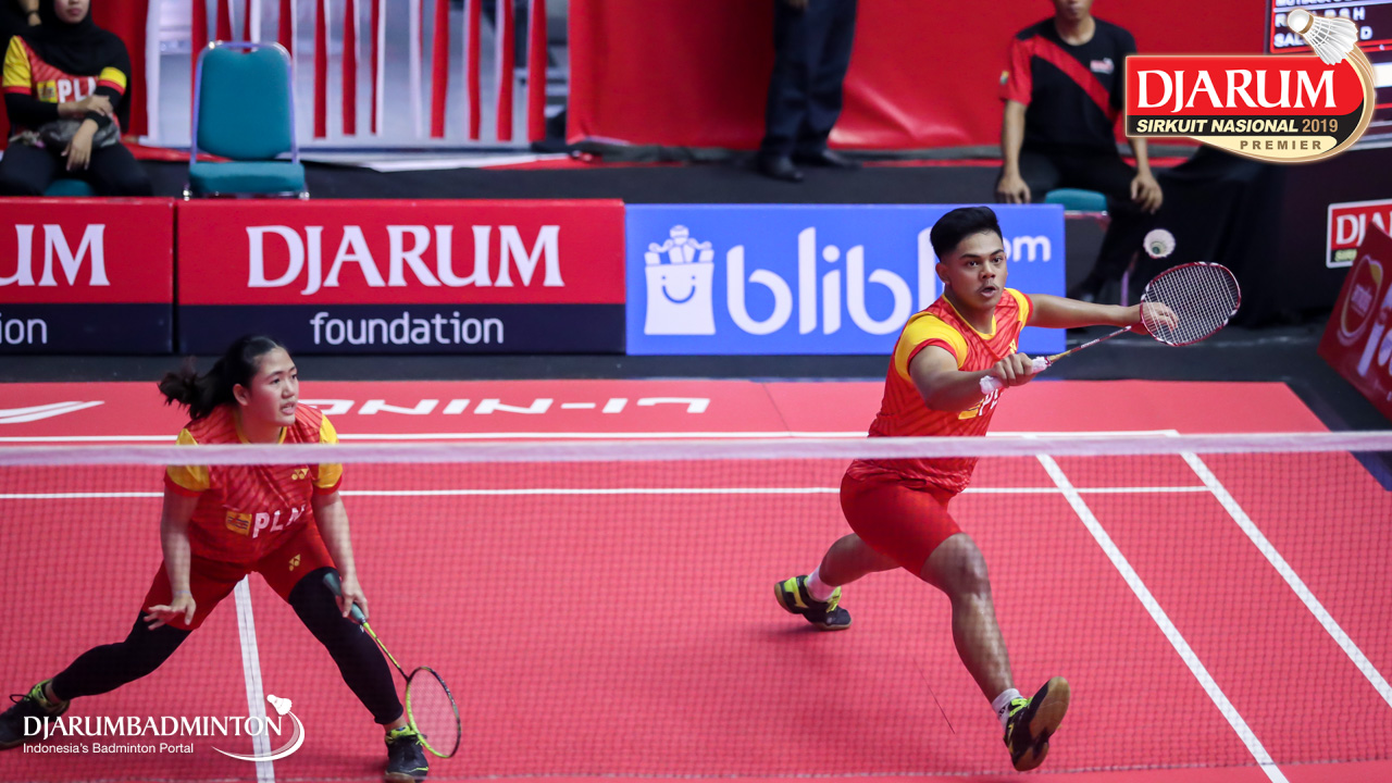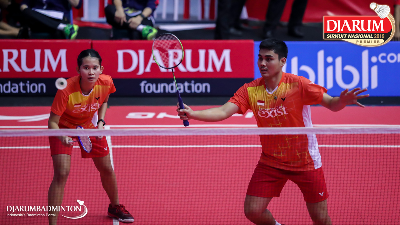 Arya Adi Saputra+Putri Larasati (Exist Badminton Club) bersiap melepaskan serangan