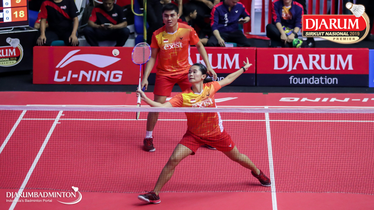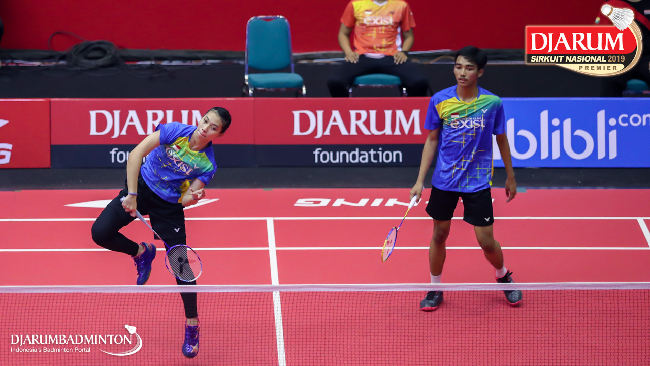 Muhammad Yusuf Maulana+Silvia Ratih (Exist Badminton Club) berusaha menggapai pengembalian