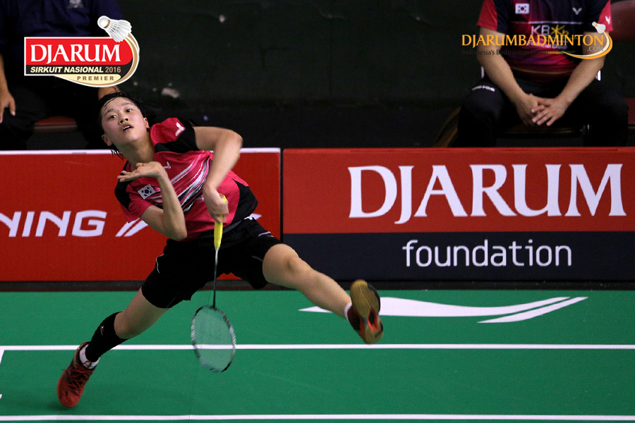 Ha Na Baek (Korea) mengembalikan shuttlecock
