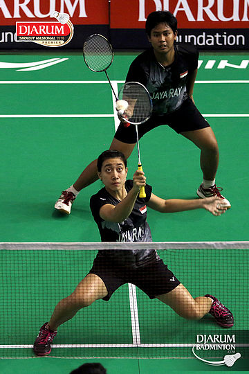Trikusuma Wardhana/Suci Rizki (Exist/Mutiara Cardinal) menyambar pengembalian tanggung