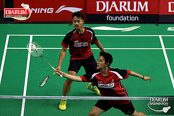 Markis Kido/Pia Zebadiah (Jaya Raya) mengembalikan shuttlecock