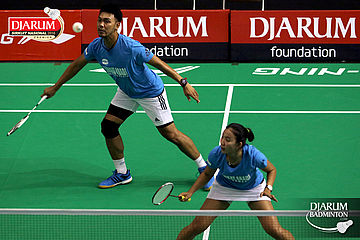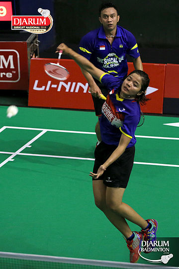 Akbar Bintang/Vita Marissa (Djarum Kudus) mengembalikan shuttlecock