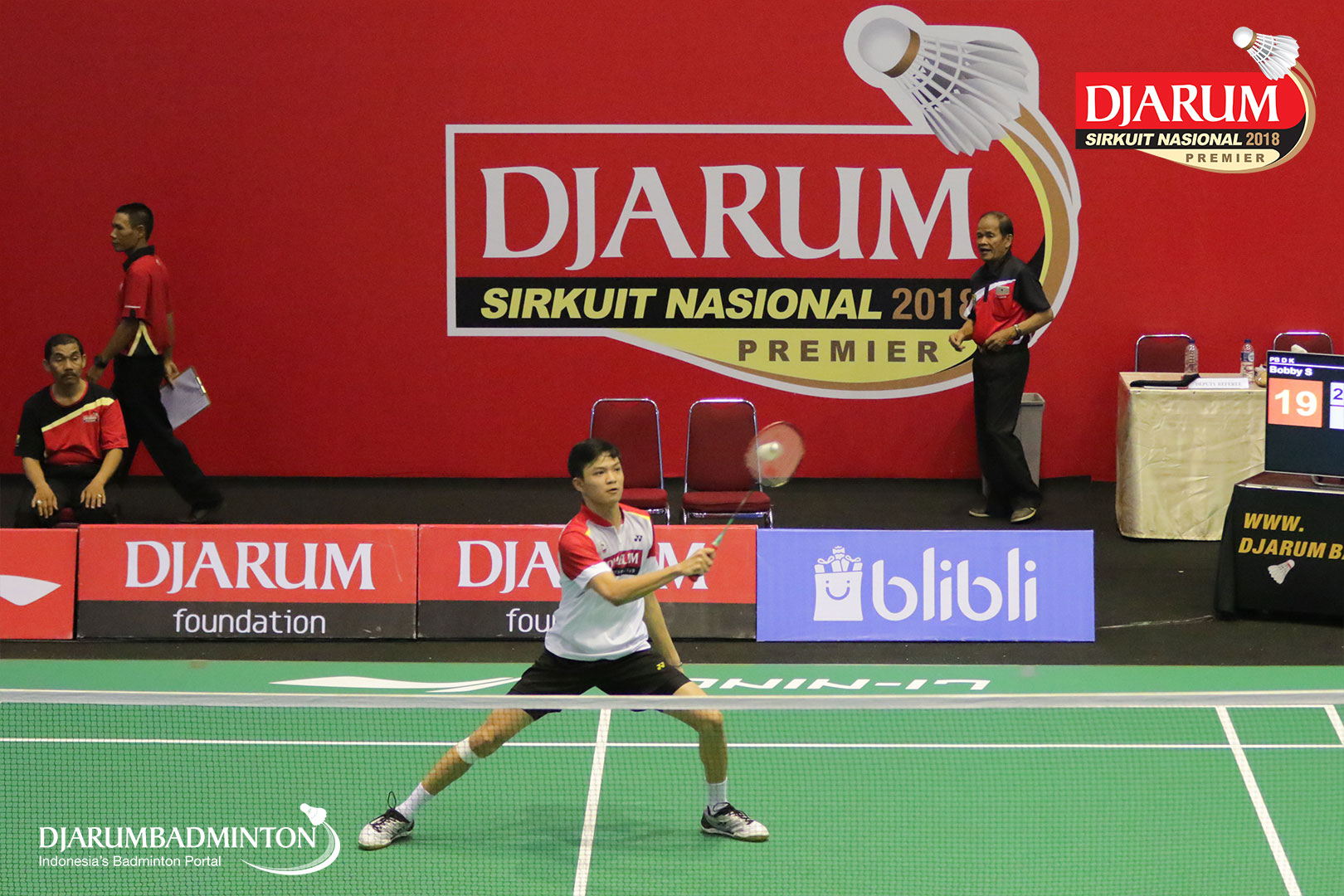 Rezha Akbar Raja Husain Ym (PB Djarum, Kudus) mengembalikan serangan