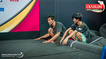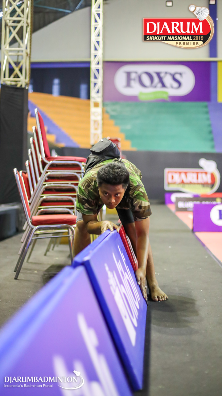 Dua orang pekerja sedang mengerjakan perlengkapan logistik Djarum Sirkuit Nasional Premier Li Ning Jawa Timur Open 2019