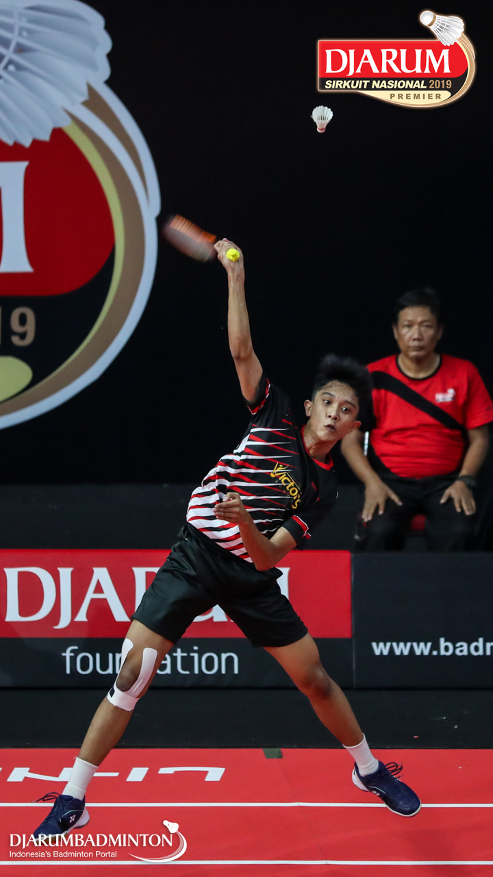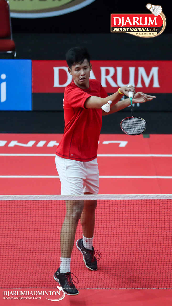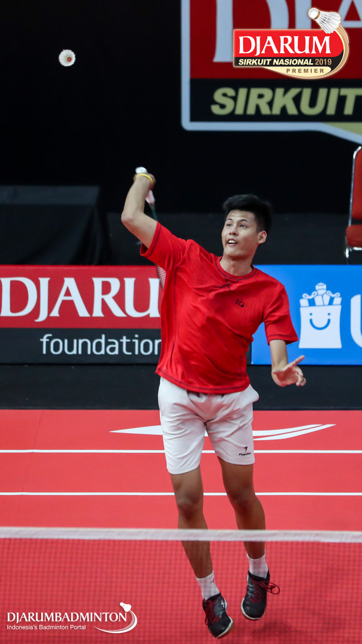 Mochammad Irsyaddullibad (Wima, Sby) bersiap menyambar shuttlecock