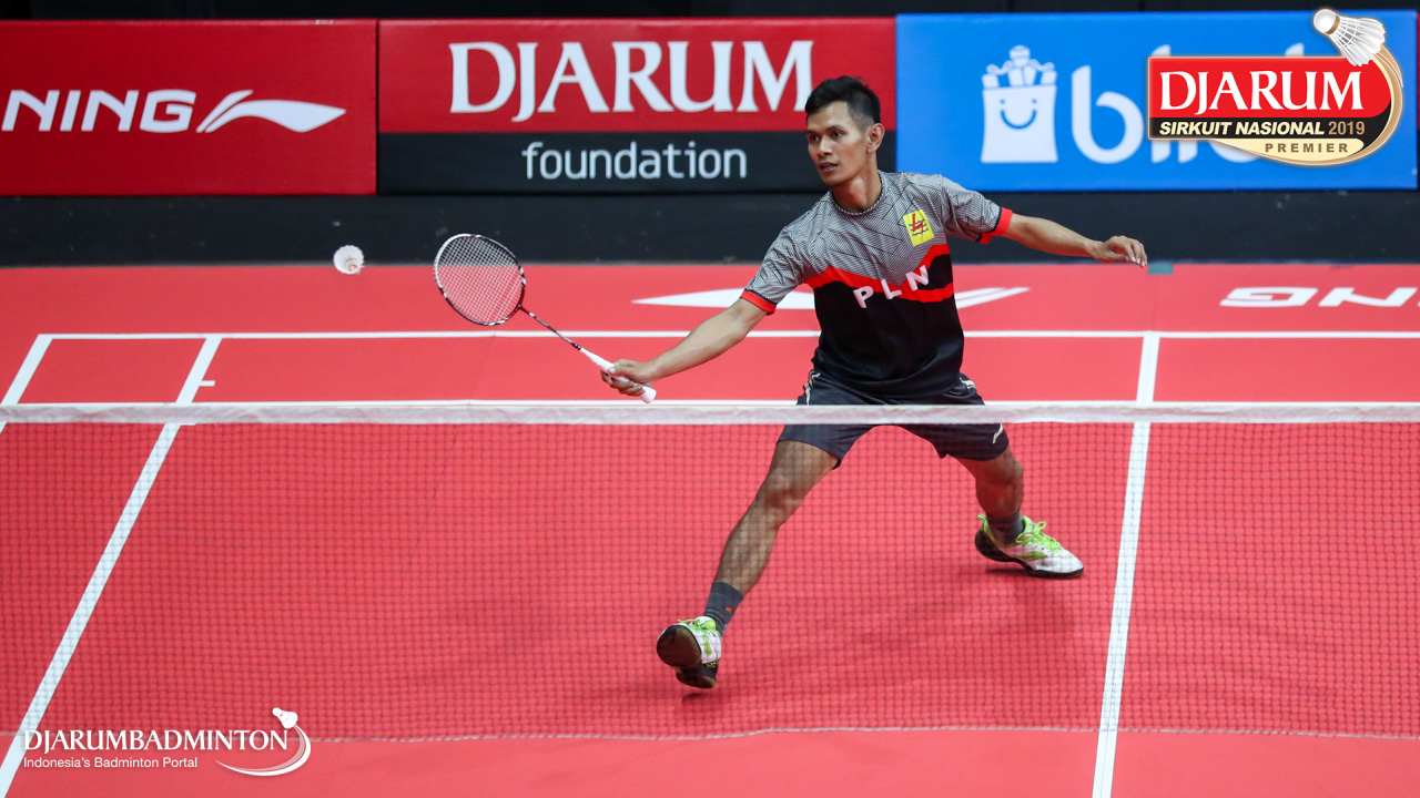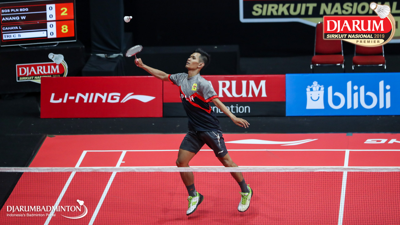 Anang Wahyudi (Sangkuriang Graha Sarana PLN Bandung) bersiap menyambut shuttlecock