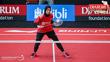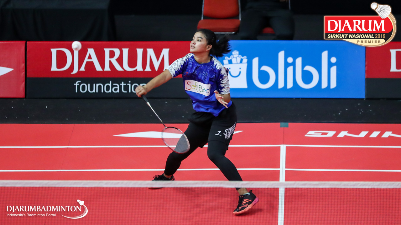 Shabrina Aulia Yasmin (Mutiara Cardinal, Bandung) bersiap mengembalikan shuttlecock