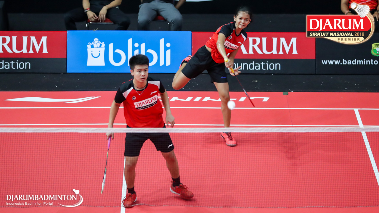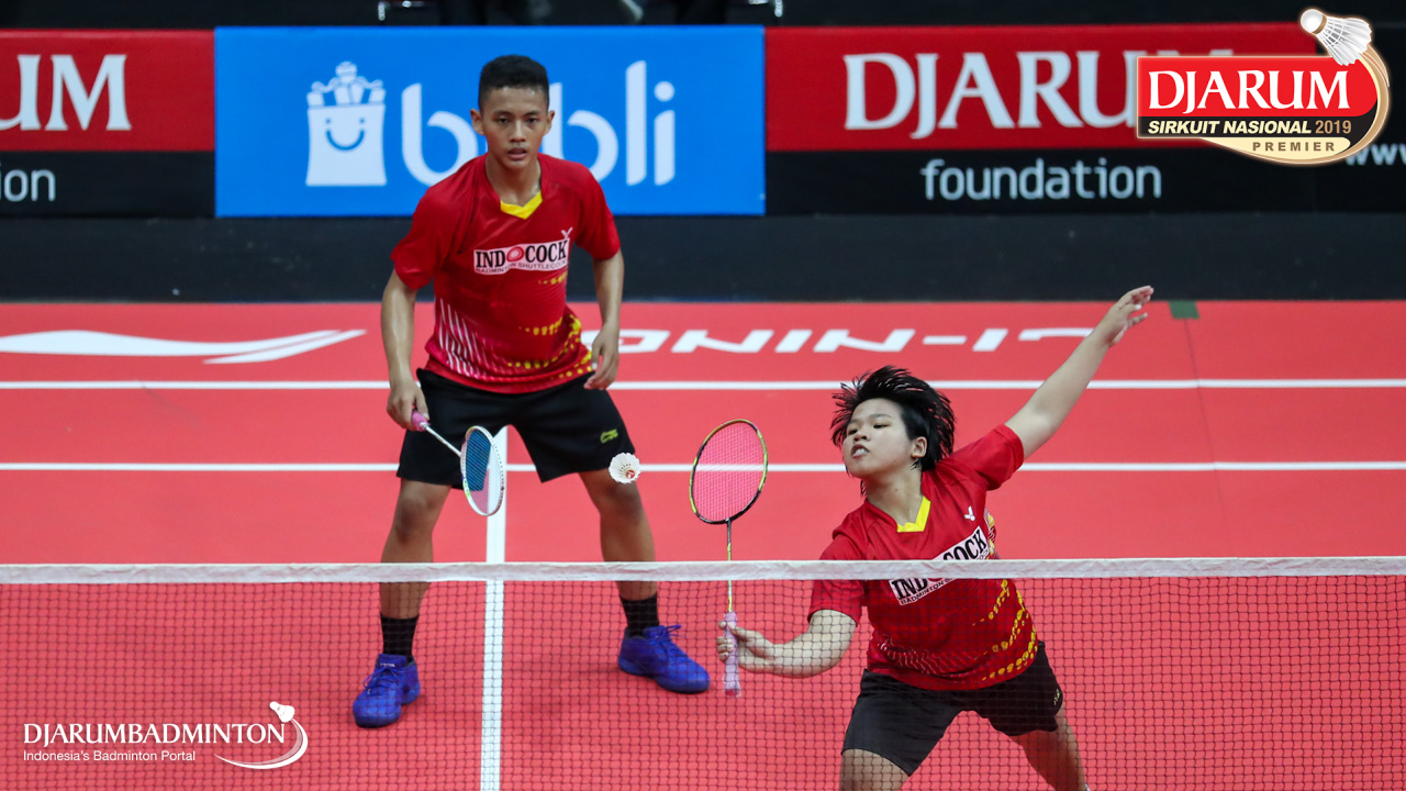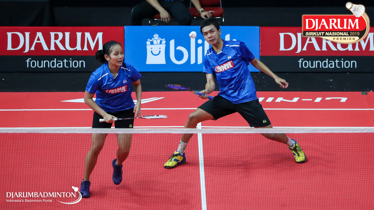 Mochamad Rafi Rizqi Kurniawan+Berliona Alma Pradisa (PB Djarum, Kudus) menyambut shuttlecock