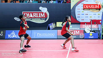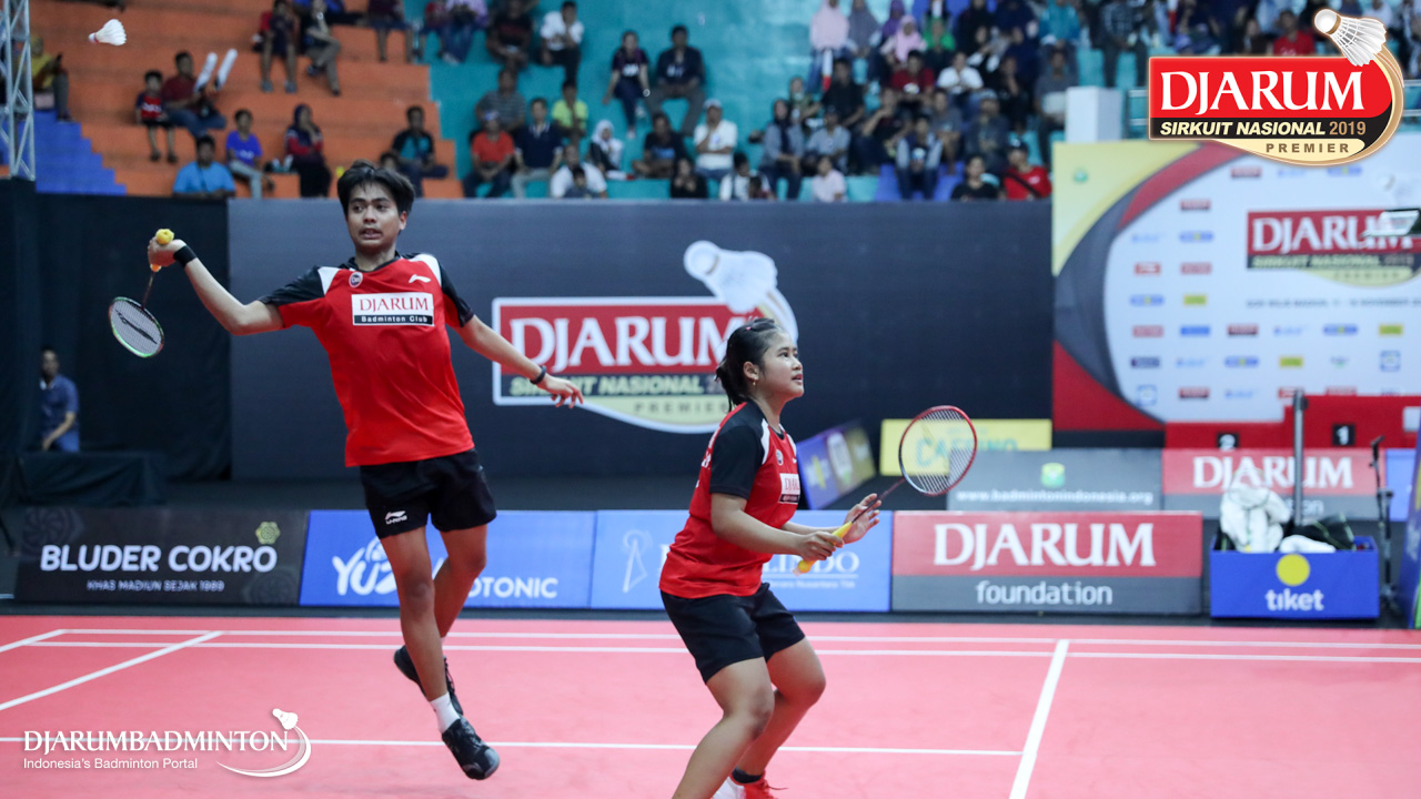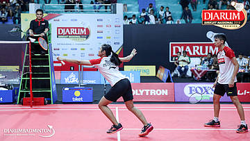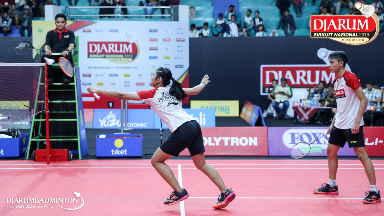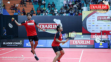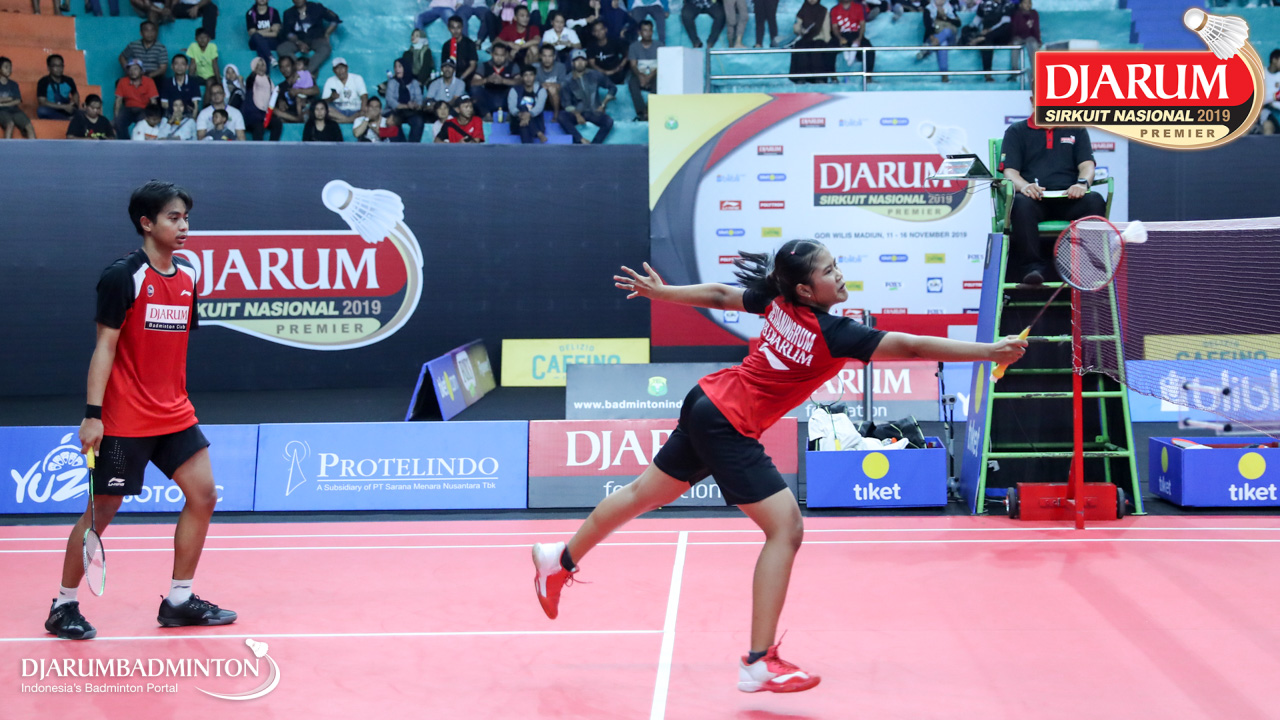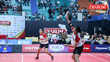 Asghar Herfanda+Sang Ayu Putu Kharisma Maharani (PB Djarum, Kudus) bersiap mengembalikan shuttlecock