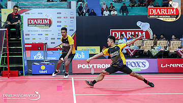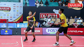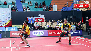 Muhammad Nendi Novatino+Teges Satriaji Cahyo Hutomo (Jaya Raya Jakarta) menyambut shuttlecock