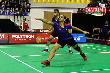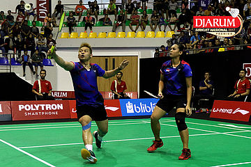 Riky Widianto/Masita Mahmudin (Tjakrindo Masters/Jaya Raya) Mengembalikan Shuttlecock