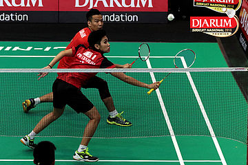 Rahmat Hidayat/Gity Gabriel Rambing (PB Djarum Kudus) Mengembalikan Shuttlecock